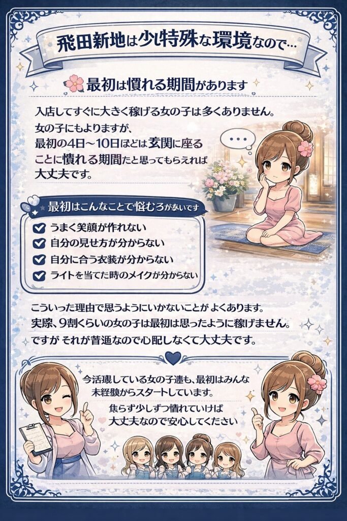 飛田新地は少し特殊な環境なので、入店してすぐに大きく稼げる子は多くありません。